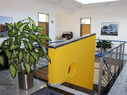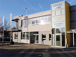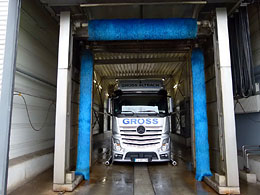 eine LKW-Waschanlage mit eigener Wasser- aufbereitung sowie zwei grosse Lagerhallen mit je 2.500 qm Fläche und mit 25 t Decken- kränen. Eine moderne Photvoltaikanlage rundet das Bild ab.