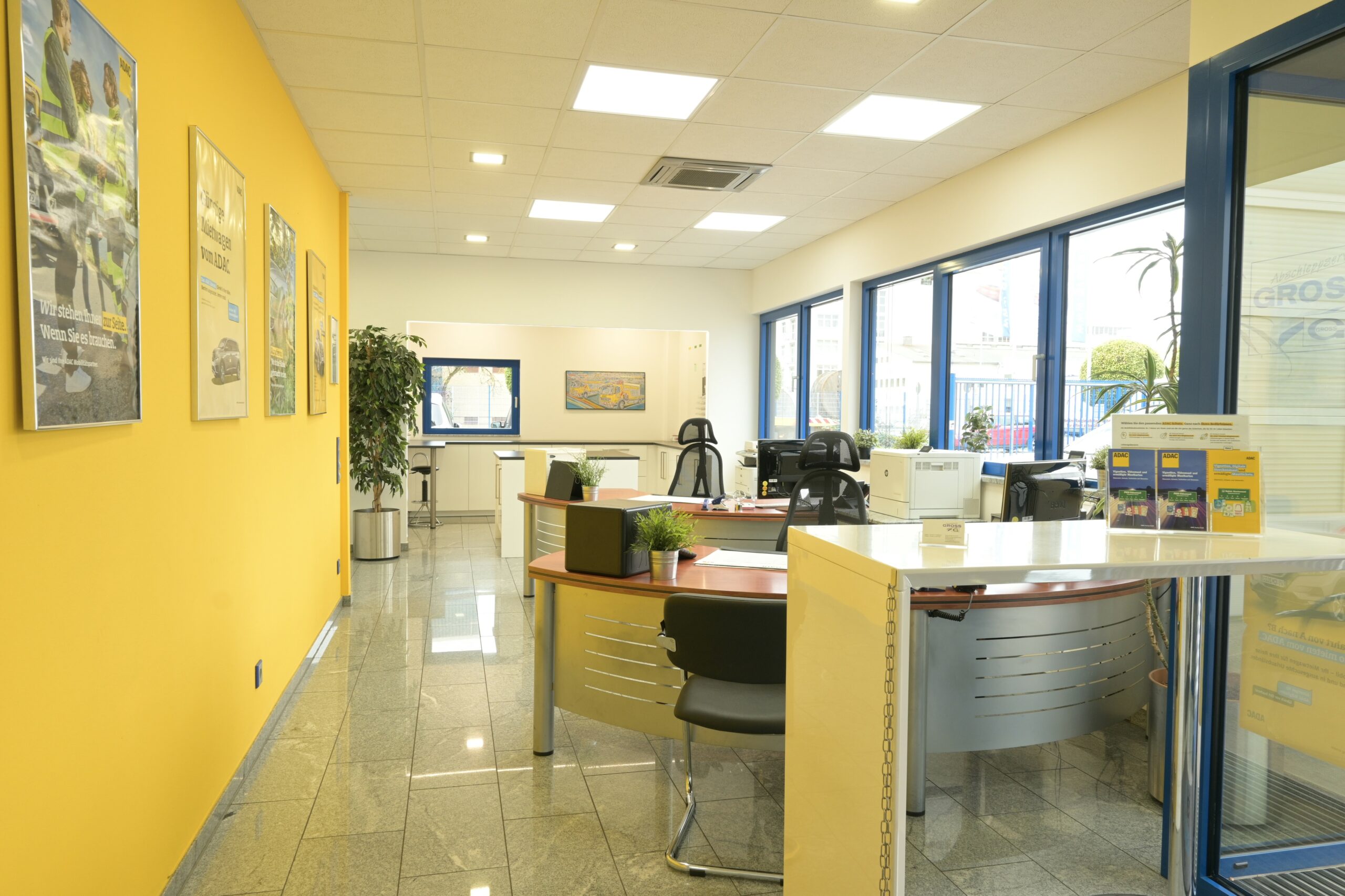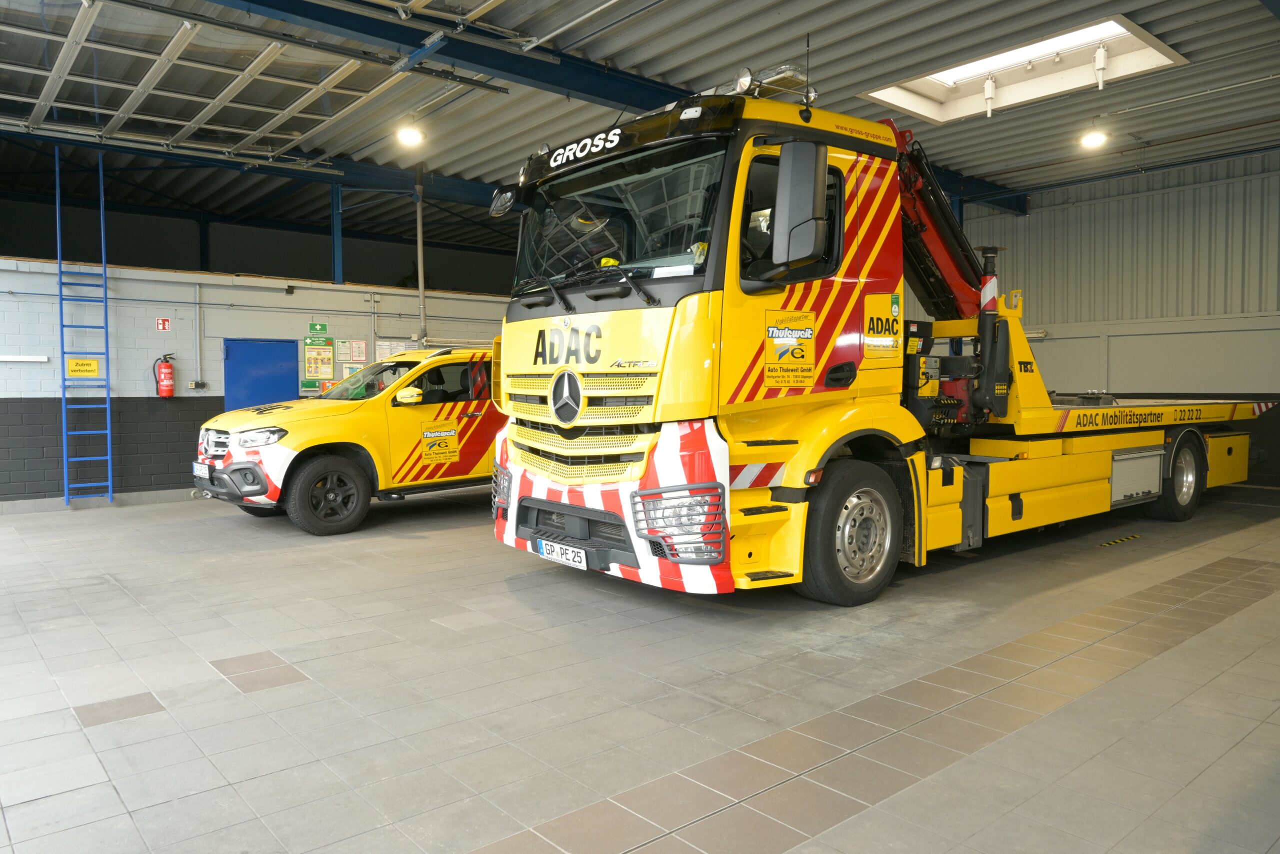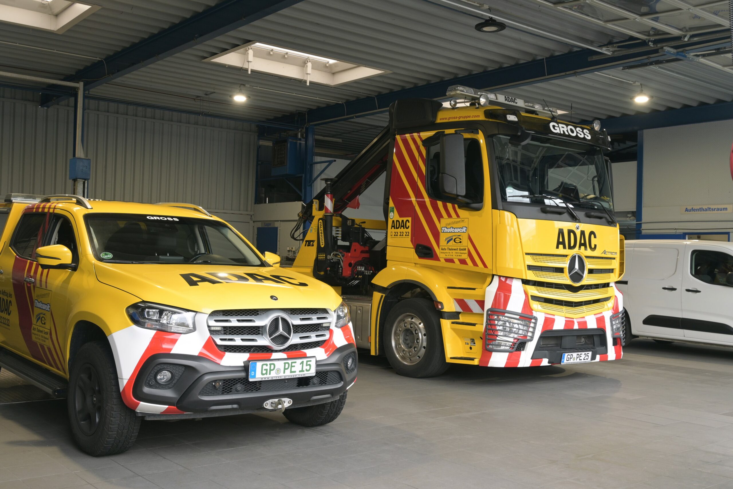 Gelber ADAC-Abschleppwagen mit Mercedes-Logo parkt vor modernem Gebäude, Fahrerhausbeschriftung Gross.